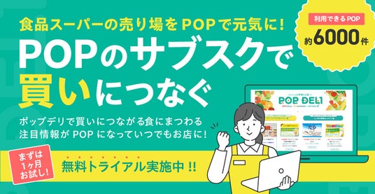 「POPDELI」とは、食に関連する完成版POPをダウンロード、即時利用できるサービスです。人手不足でも売り場のPOP展開を強化でき、かつ現場スタッフのPOP制作負担を軽減できます。