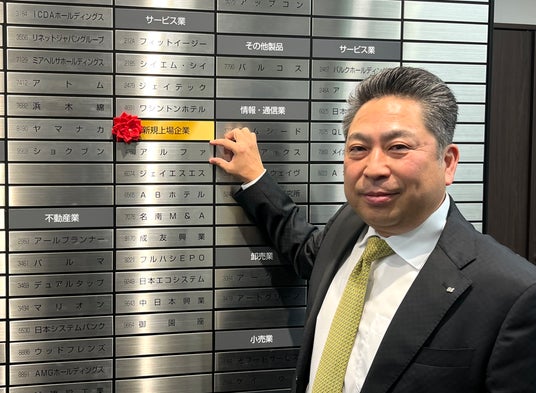 名古屋証券取引所の銘柄ボード前で新規上場した当社プレートを指差す岡本社長