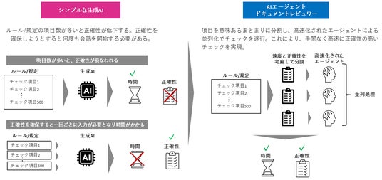 「ドキュメントレビュワー」は、文書確認に機能を特化したAIエージェントです。独自の構造化プロンプト※2を活用しており、膨大な確認項目を自動で意味のあるまとまりに分割して抽出し、AIエージェントが並列処理でタスクを高速で遂行します。一般的な生成AIでは正確性や所要時間が課題となる、複雑で膨大な項目の確認が必要な文書を、正確かつ迅速に確認することが可能です。修正が必要な箇所については自動で代替案を作成するため、文書作成業務を大幅に効率化することができます。