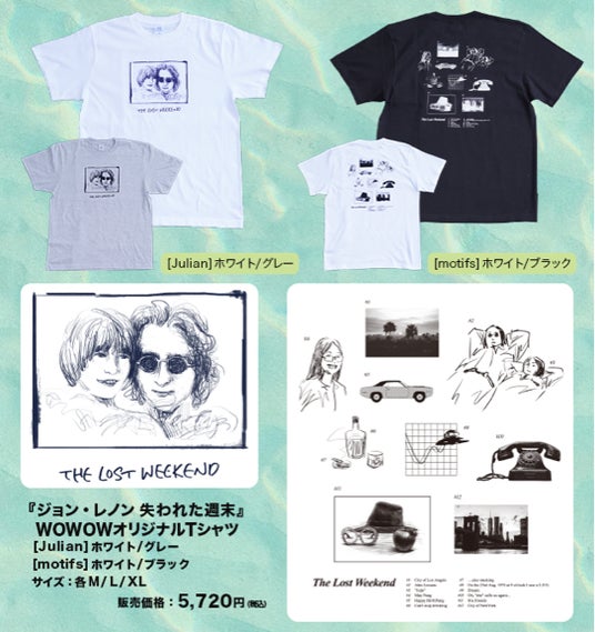 「wowshop(https://wowshop.jp/)」では『ジョン・レノン 失われた週末』WOWOWオリジナルTシャツが発売中。ジョンがLAで過ごした18ヶ月間あまりの日々。その世界観が落とし込まれたデザインが2種類登場。1つ目のデザイン[Julian]では、ジョンの長男であるジュリアン・レノンとのツーショット写真をイラストレーションで表現。 Tシャツフロント部分を飾るのは、長らく疎遠となっていた父子の仲睦まじい姿。ビーチで過ごした親子水入らずの時間を、メイ・パンがカメラに収めた感動の1枚をここに再現。心温まるデザインとなった。ボディのカラーは、ホワイト(イラスト部分:ブルーブラック)とグレー(プリント部分:ブラック)、2色で展開。2つ目のデザイン[motifs]は、「失われた週末」を構成した要素がバックプリントに結集したニッチな1枚。当時のメイ・パンやジョン&ジュリアンの仲睦まじい様子を描いたイラストレーションをはじめ、様々な場面を凝縮。 NYを去り、ジョンとメイ・パンが辿り着いたLA。そこでふたりが目撃したというUFOや、ジョンが誕生日にメイ・パンへプレゼントした車。また音楽活動が盛んとなり、あのスターたちと飲んだくれつつ、“ジャムった”エピソードをイメージさせるイラストたちが散りばめられている。そのほかのモチーフにはどんな意味があるのか、そしてジョンのラッキーナンバー“9”がイラストレーション上では欠番となっている点も、考察を楽しんでいただきたい。ボディカラーは、ホワイト(イラスト部分:ブラック)とブラック(プリント部分:ホワイト)の2色。サイズは各種M、L、XLをご用意。ジョン・レノンの知られざる日々を描いた同作。その物語から着想を得たWOWOWオリジナルTシャツで、 “素顔のジョン”をまとっていただきたい。