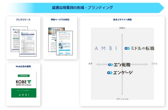 プレスリリースや特設ページ、Web広告での告知に加え、各求人サイトでの集客サポートを実施いたします。『エン転職』『エンゲージ』『AMBI』『ミドルの転職』とターゲットの異なる4つの求人サイトを活用することで、ターゲットへ網羅的に求人を届けます。