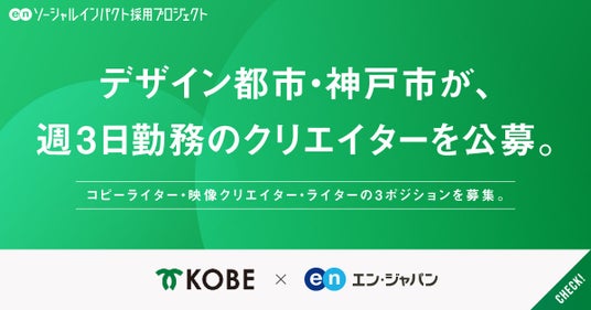 エン・ジャパン株式会社(本社:東京都新宿区、代表取締役社長:鈴木孝二)は、2024年10月28日(月)より、神戸市の『ソーシャルインパクト採用プロジェクト』(https://www.enjapan.com/)を開始しました。当社が運営する採用支援サービスを通じ、「コピーライター」「映像クリエイター」「ライター」の3職種を募集。下記、本プロジェクト概要と、神戸市 多名部氏のコメントを紹介します。