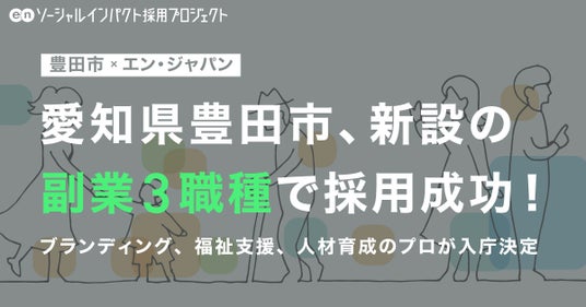 エン・ジャパン株式会社(本社:東京都新宿区、代表取締役社長:鈴木孝二)は、2024年8月に愛知県豊田市の『ソーシャルインパクト採用プロジェクト』(https://www.enjapan.com/)を実施。新設の「副業3職種」を公募した結果、すべてのポジションで計3名の入庁が決定しました。下記、豊田市役所よりそい支援課 地域共生・社会参加担当長 安藤氏と、入庁者3名のコメントを紹介します。