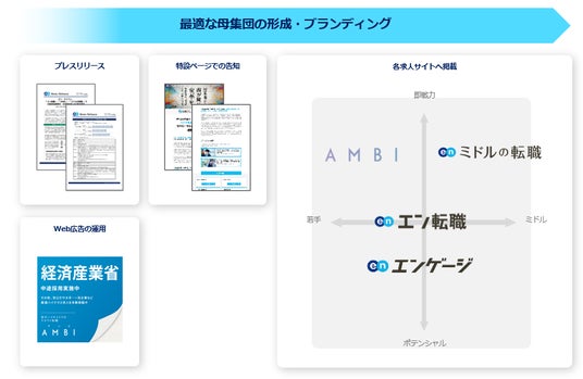 プレスリリースや特設ページ、Web広告での告知に加え、各求人サイトでの集客支援を実施。『エン転職』『エンゲージ』『AMBI』『ミドルの転職』とターゲットの異なる求人サイトを活用することで、ターゲットへ網羅的に求人を届けます。