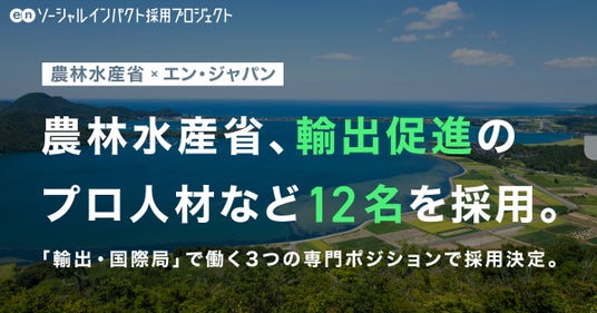 エン・ジャパン株式会社(本社:東京都新宿区、代表取締役社長:鈴木孝二)は、2024年7月に農林水産省の『ソーシャルインパクト採用プロジェクト』(https://www.enjapan.com/)を実施。輸出・国際局にて3職種を公募した結果、12名の採用が決定しました。下記、同省 輸出・国際局 採用担当 佐藤氏と採用者から3名のコメントを紹介します。