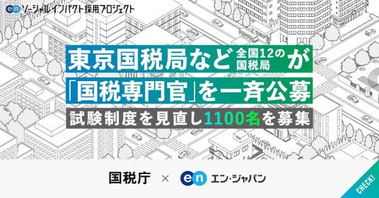 経済社会が大きく変化している中で、近年の経済取引の国際化や高度情報化等に対応し、今後も納税者の自発的な納税義務の履行を適正かつ円滑に実現していくためには、多種多様な経験や知識を持つ人材の確保が不可欠。そこで今回、将来にわたって多くの方に「国税専門官」を志望してもらうため、試験制度を見直し、エン・ジャパンの支援のもと広く人材を募ることになりました。