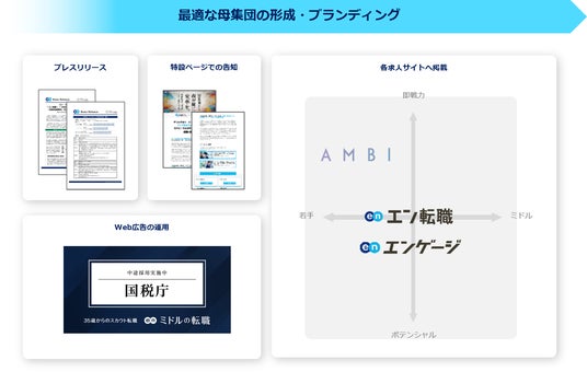 プレスリリースや特設ページ、Web広告での告知に加え、各求人サイトでの集客支援を実施。『エン転職』『エンゲージ』『AMBI』とターゲットの異なる求人サイトを活用することで、ターゲットへ網羅的に求人を届けます。