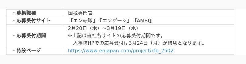 エン・ジャパン株式会社(本社:東京都新宿区、代表取締役社長:鈴木孝二)は、2025年2月20日(木)より、国税局の『ソーシャルインパクト採用プロジェクト』(https://www.enjapan.com/)を開始しました。当社が運営する採用支援サービスを通じ、全国12の国税局の「国税専門官」公募をサポートします。下記、本プロジェクト概要と東京国税局のコメントも紹介します。