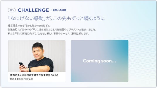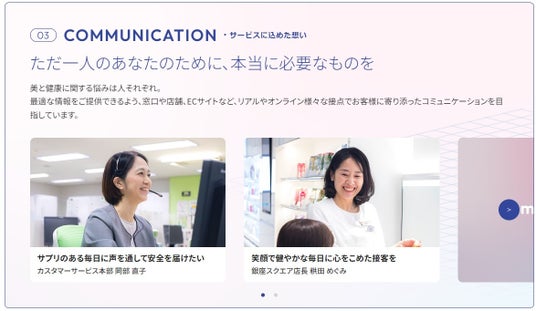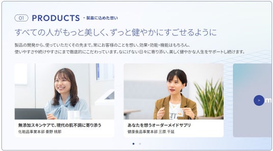 本サイトは、2024年5月に新たに制定したスタンスメッセージに込めた、お客様に寄り添い続ける当社の取り組みを紹介するWEBサイトです。当社の取り組みを5つのカテゴリーに分け、「5つの想い」という形で従業員のインタビューを通じて紹介しています。今後も順次コンテンツを拡充し、お客様の美しさと健やかさに一生涯寄り添い続けていくブランドの姿勢と活動を発信していきます。