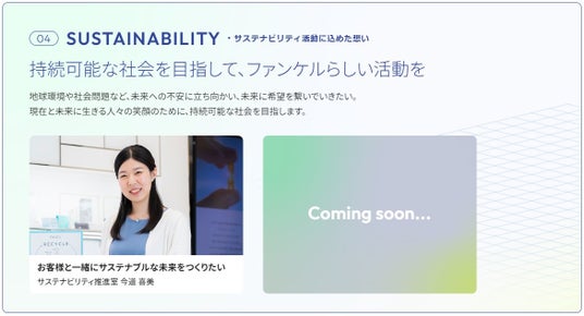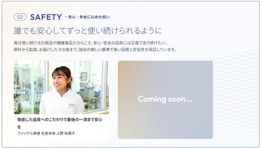 株式会社ファンケルは本日11月29日(金)に、新スタンスメッセージ「なにげない感動をずっと。」に込めた想いを当社従業員が語るWEBサイト「ファンケルが大切にする、5つの想い」をコーポレートサイト内に開設しました。