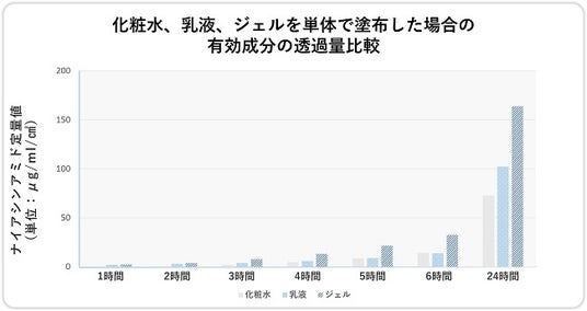 試験の結果、ジェルを単体で塗布した場合の有効成分の透過量は、化粧水、乳液を単体で塗布した場合と比較して高くなることを確認しました。