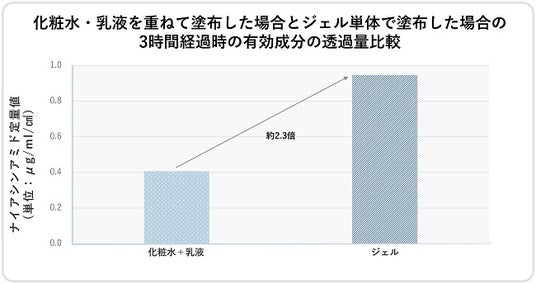 試験の結果、ジェル単体で塗布した場合の有効成分の透過量が、化粧水と乳液を重ねて塗布した場合と比較して約2.3倍高くなると確認しました。
