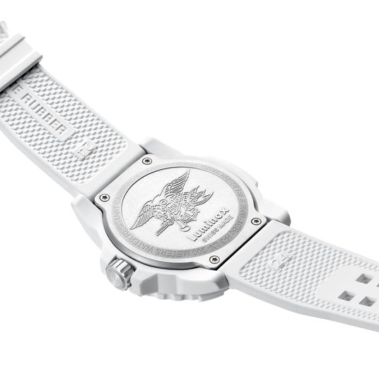 今回の新作は、氷に覆われた過酷な環境で活動する隊員のために設計された印象的なホワイトモデル。軽量なホワイトのファイバーグラス製ケースとベゼルという新モデルは、雪山でのカモフラージュや耐久性などによりシールズ隊員だけでなく北極探検家にも最適です。