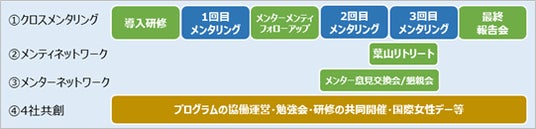 「クロスメンタリング」とは、メンター(支援者、助言者)とメンティ(支援・助言を受ける立場)が他企業同士となる組み合わせで行う、企業横断型のキャリア形成支援の取り組みです。本クロスメンタリングでは、経営幹部がメンター、女性管理職がメンティとなってメンタリングを行うことで、女性管理職の自律的キャリア形成と、多様な人財が企業を超えて学び、育て合うことによるジェンダーギャップ解消の加速を目指します。