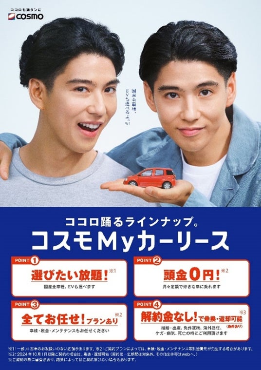 コスモエネルギーホールディングス株式会社(代表取締役社長:山田 茂)のグループ会社であるコスモ石油マーケティング株式会社(代表取締役社長:森山 幸二)は、カーリースサービス「コスモMyカーリース」に、お客様のライフステージの変化に対応するべく、2024年10月1日より中途解約サービスを追加します。中途解約サービスとしては業界初となる、家族構成の変化による乗換えやご契約者様の海外赴任を含む合計5パターンの事由に対し、解約金なしの乗換え・返却が可能となります。10月1日以降にご契約される方は、もれなく手続等不要で適用されます※。