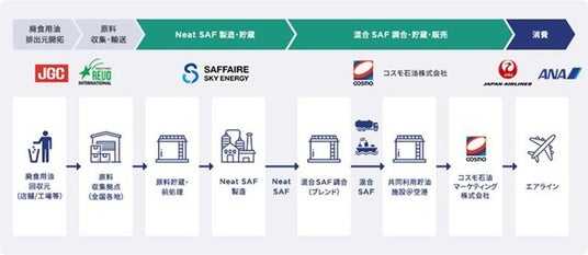 コスモエネルギーホールディングス株式会社(代表取締役社長:山田 茂)のグループ会社であるコスモ石油マーケティング株式会社(代表取締役社長:森山 幸二、以下「コスモ石油マーケティング」)は、合同会社SAFFAIRE SKY ENERGY(代表:秋鹿 正敬、以下「SAFFAIRE SKY ENERGY」)が国内で製造する持続可能な航空燃料(Sustainable Aviation Fuel、以下「SAF」)について、2025年度から日本航空株式会社および全日本空輸株式会社に供給開始することをお知らせします。2025年度以降、国内エアラインへの供給開始に伴い、日本国内では初となる国産SAFサプライチェーンの構築が実現します。