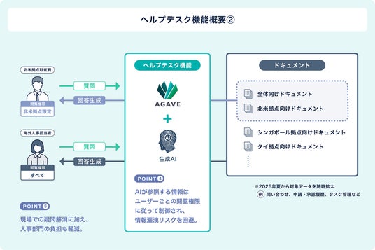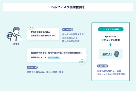 本機能は、AGAVEが提供する規程集や各種ガイドを管理・共有する「ドキュメント機能」に蓄積された情報を活用し、海外駐在員や人事担当者からの多様な問い合わせに対して、生成AIが即時に自動回答を行うものです。当社では、AGAVEをお客様の海外人事業務を統合・支援する基幹プラットフォームとして継続的に強化しており、本リリースはその戦略的展開の一環となります。