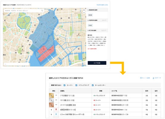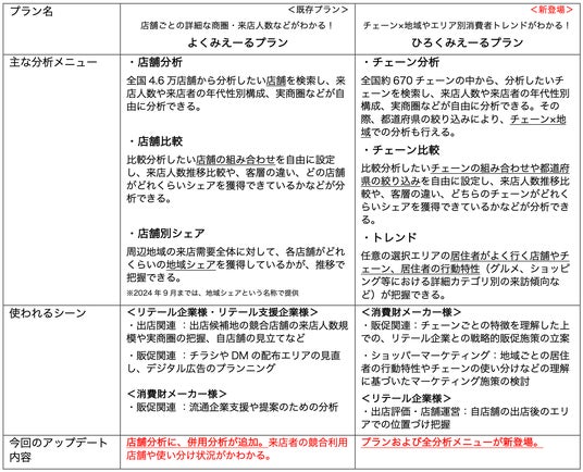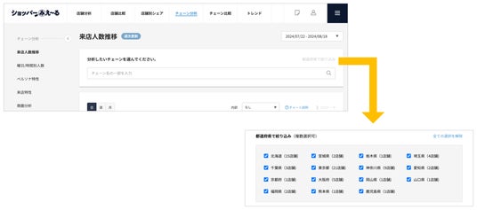 今回新たに提供開始した新プランは、これまでの個別店舗別の詳細分析とは異なり、チェーン×都道府県における分析や、任意のエリアの来店者数ランキングなど、メーカー企業様の流通・販促戦略やリテール企業様の地域戦略をサポートする分析機能を搭載しています。