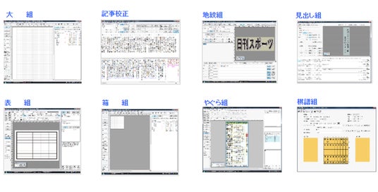 大組/地紋組/表組/箱組など、新聞制作に不可欠なレイアウト機能を標準搭載しています。また、紙面管理機能、統合集信機能、文字管理機能、出力管理機能、広告管理機能、外部配信機能など、編集から配信までを一元的に支援する各種機能も備えています。これにより、編集現場の多様なニーズに応え、新聞制作全体の質とスピードを向上させることが可能です。