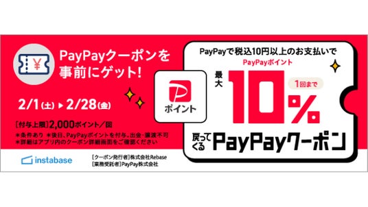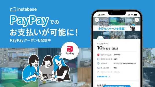株式会社Rebase(本社:東京都渋谷区、代表取締役:佐藤 海、以下当社)が展開するレンタルスペースのマッチングプラットフォーム「instabase(インスタベース)」で、PayPay株式会社(以下、PayPay)が提供する「PayPay」が利用可能になりました。さらに、サービス導入に合わせ、PayPayでのお支払いで最大10%の「PayPayポイント」が戻ってくるクーポンを2月1日(土)~2月28日(金)まで配信中です。