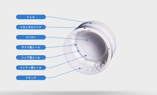 いたずら防止機能をもった当社オリジナルキャップ「TEN-CAP(Tamper Evidence with New concept)」は内装部(食品接触部)のパッキンと外装部(食品非接触部)のシェルの2ピース構造になっています。この独立した2ピース構造により密封性と開栓性の役割を分離しています。パッキンは密封性機能を受け持ち、シェルは締結・開栓性能を受け持っています。本取り組みでは、内容物に直接接触しない外装部のみにリサイクル素材を混合しています。