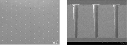 開発中のガラスコア基板の微細貫通穴(ビア)と断面画像 TOP部Φ75μm、ピッチ250μm、基板厚み0.4mm ビアメカニクス(株)レーザ加工機にて加工