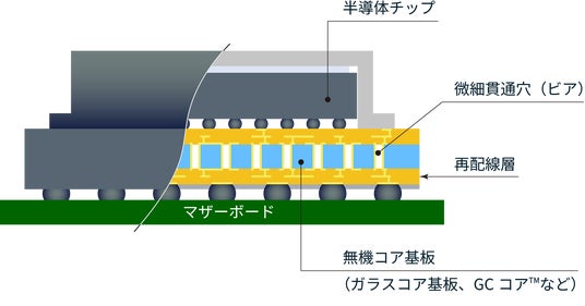 近年、AI半導体の高性能化に伴い、チップレット構造※の採用が進み、搭載するダイの大型化とダイ数の増加が進んでいます。これに伴い、半導体のチップとマザーボードを接続するためのコア基板の大型化需要が高まっています。