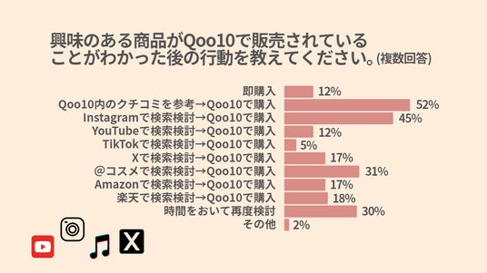 2. 興味のある商品がQoo10で販売されていることがわかった後の行動として、「Qoo10内のクチコミを参考」にしたうえでQoo10で購入する人が52%と最も多く、「Instagramで商品検討」したうえでQoo10で購入する人が45%と次に多い結果となった。