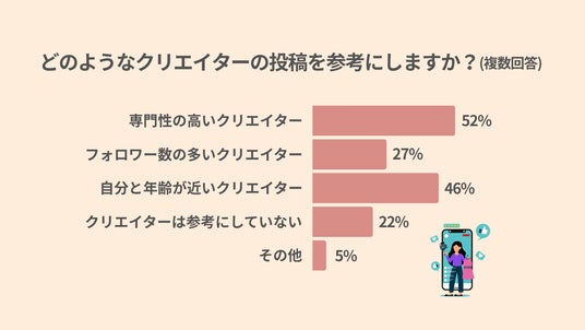 7.SNSクリエイター(インフルエンサーなど)の投稿の中でも、「専門性の高いクリエイター」の投稿を参考にする人が52%と最も多く、「自分と年齢が近いクリエイター」を参考にする人が46%と次に多い結果となった。