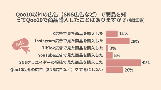 6.Qoo10の広告以外に「クリエイターの投稿」を見てQoo10で商品を購入した人が41%と最も多く、「Instagram広告」を見てQoo10で商品を購入した人が28%と次に多い結果となった。