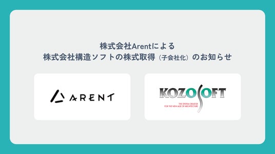 株式会社Arent(本社:東京都港区、代表取締役社長:鴨林 広軌、以下「Arent」)は、建築関連パッケージソフトウェアの企画・開発・販売を手がける株式会社構造ソフト(本社:東京都北区、代表取締役:原 泰紀、以下「構造ソフト」)の株式(持分比率 100%)を取得することを本日、取締役会で決議いたしましたので、お知らせします。