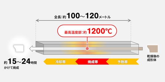 中央付近が最高温度(約1200℃)となるように窯内部の温度が調整されており、入口から出口に向かって約15~24時間かけて製品を搬送させることで焼き上げます。