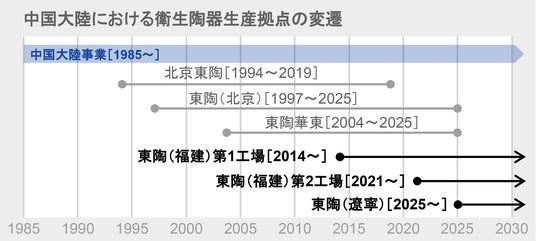 TOTOの中国大陸事業は、急速な市場変化への対応遅れに伴う業績悪化を踏まえ、同事業を立て直し、継続していくための構造改革を断行しています。構造改革の一つとして2025年4月、東陶機器(北京)有限公司(1997年稼働)および東陶華東有限公司(2004年稼働)での衛生陶器の生産を停止しました。今後は、東陶(遼寧)および東陶(福建)の2拠点体制で、中国大陸市場向けの衛生陶器を最新鋭の生産設備で生産・供給していきます。2拠点を合わせた生産能力は、約265万ピース[※2]/年となります。