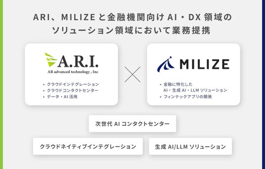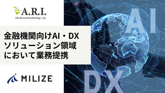 ARアドバンストテクノロジ株式会社(本社:東京都渋谷区、代表取締役社長:武内 寿憲、以下ARI)は、株式会社MILIZE(本社:東京都港区、代表取締役社長:田中 徹、以下 MILIZE)と、金融機関向けAI・DX領域でのソリューション開発を目的に2024年10月に業務提携を締結したことをお知らせいたします。