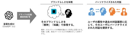 「BrandDialogueAI」は、ChatGPTにブランド人格を付与し、各企業が保有する顧客データや商品データ等を基にしたダイナミックプロンプト(※2)技術を通じて、各顧客とOne to Oneの対話を実施することができるAIチャットボットです。