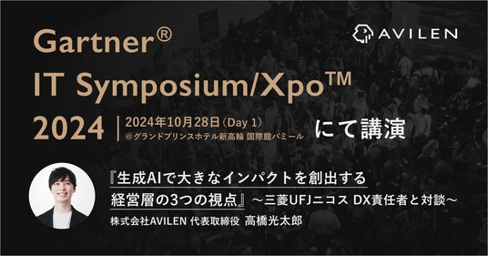 株式会社AVILEN(本社:東京都中央区、代表取締役:高橋 光太郎、以下「AVILEN」)は、2024年10月28日(月)~30日(水)グランドプリンスホテル新高輪 国際館パミールにて開催の「Gartner IT Symposium/Xpo(TM)2024」に出展することをお知らせいたします。