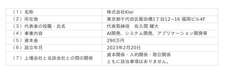 当社は、本日開催の取締役会において、以下のとおり、生成AI関連の開発実績を有しAIトランスフォーメーションのコンサルティングに特化した株式会社Kiei(以下「Kiei」)と業務提携契約を締結することについて決議いたしましたので、お知らせいたします。