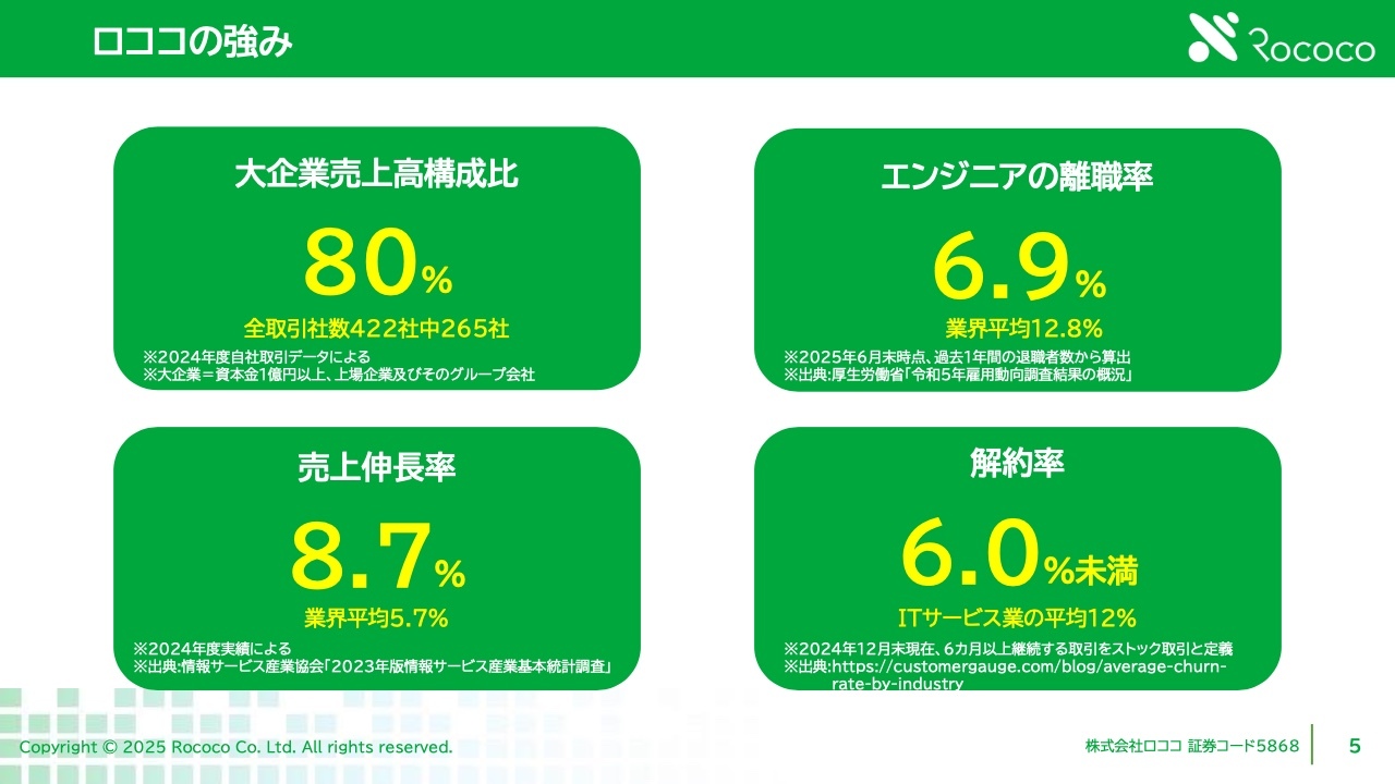 スライド5ページに記載のとおり、当社は大企業との取引が全体の80パーセントを占めています。エンジニアの離職率も業界平均の12.8パーセントと比べ、半分近く低い水準です。当社では、社員がしたい仕事を常に上司が聞き、新しい仕事に就くことについて双方が話し合いの上で、社員本人が望む仕事を任せる体制を整えています。