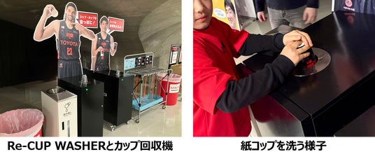 東洋製罐グループは、2022-23シーズンよりアルバルク東京とSDGsパートナー契約を締結し、リサイクル可能な飲料用アルミカップや、紙コップを資源として循環させるための「Re-CUP WASHER」を導入することで、持続可能なアリーナ運営を目指してさまざまな検証を進めてきました。アリーナにおける紙コップの回収率は、2022-23シーズンが23.9%、2023-24シーズンは38.1%となっており、アリーナ内での紙コップのリサイクルに関する認知度が向上しました。また、2024-25シーズンからは食品用紙カップの回収実験も実施しています。