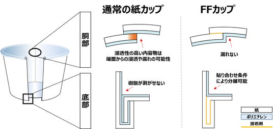 今秋開業する「TOYOTA ARENA TOKYO」では、当社の連結子会社である東罐興業株式会社(本社:東京都品川区、代表取締役社長:田辺宏信、以下「東罐興業」)にて新開発した「FF(Film Forming)カップ」が世界で初めて正式採用されます。従来の紙コップや食品用紙カップは、内面を保護するためにポリエチレンの薄い膜を原紙に貼り合わせてから成型をしますが、本製品は原紙をカップ状に成型した後に内面にポリエチレンのフィルムを圧着するため、汁物や油物などの内容物が原紙に浸透しにくく、さまざまな食品に対応可能です。さらに、貼り合わせの条件を調整することで、食べ終わった後にフィルムをはがすことが可能です。そのため、内面の汚れなどの理由で産業廃棄物として焼却されたり、ダンボール等にしかリサイクルできなかった従来の食品用紙カップと違い、本製品はまた紙コップの原料として水平リサイクルできます。