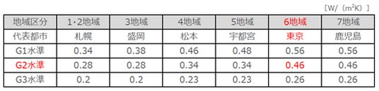 しかし、この地域補正の必要性についてはあまり周知が進んでおらず、手間も要することから、以下の表のように「東京のG2:UA=0.46W/(m2K)」等の代表都市における必要断熱性能として例示されている値が、その代表都市が所在する地域区分の全域に共通した基準値として用いられているケースが多いのが現状です。