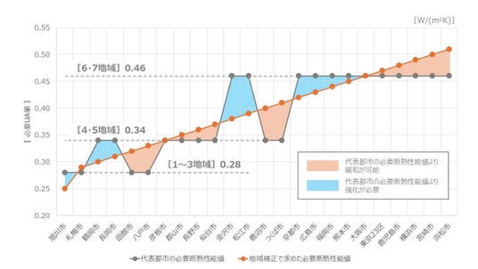 HEAT20 G2の代表都市の必要断熱性能値と地域補正で求めた必要断熱性能値の違い