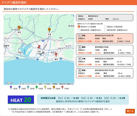 「LIXIL省エネ住宅シミュレーション」は、省エネ住宅を建てる際、断熱材や開口部商品や設備機器を選択していくだけで外皮性能値と一次エネルギー消費量を自動算出するシステムです。このシステムでは、外皮性能値の算出の際に出てしまう誤差をアメダス観測所を選択するだけで地域補正し、より精緻な断熱性能値(※)を一目で確認することができます。LIXILでは、建設地の住所を入力するだけで最寄りの複数のアメダス観測所を地図上にプロットして、建設地からの距離や標高差、暖房負荷も表示する技術を開発。この仕組みを「LIXIL省エネ住宅シミュレーション」の機能に追加して2024年3月に公開しています。また、設計している住宅の地域補正値への適合判定やさらにエンドユーザーさまにHEAT20や地域補正を説明するための提案書と認定・優遇制度の申請時に必要な計算書の自動作成にも対応しています。