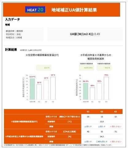 また、4月にHEAT20の「外皮性能水準地域補正ツール」の算出方法に一部変更があり、それに合わせて「LIXIL省エネ住宅シミュレーション」の算出方法も変更を行っており、「地域補正UA値計算結果」も出力することができるようになりました。今後も、住宅事業者さまには最新の仕様で簡単にHEAT20の家づくりをご提案いただけます。