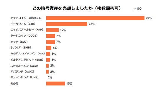 売却した暗号資産の銘柄を尋ねたところ、「ビットコイン(BTC/XBT)」が79%で最多でした。「イーサリアム(ETH)」が33%、「エックスアールビー(XRP)」が10%と続きました。