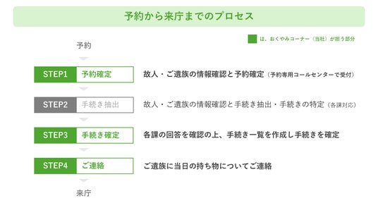 各区役所に1名の専用スタッフを配置し、予約制(1日最大4枠)での対応を行います。予約専用コールセンターは3名体制で、10月1日より受付を開始し、遺族のヒアリングを通して必要な手続を抽出し、スムーズな手続きサポートを提供いたします。