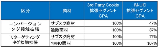 ※3rd Party Cookie拡張セグメント配信のCPAを100%とし、IM-UID拡張セグメント配信のCPAの割合を算出
