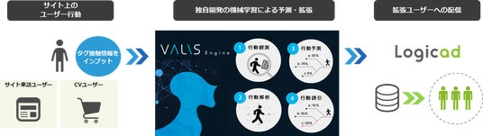 SMNが独自開発した人工知能、「VALIS-Engine」による拡張配信メニューです。リターゲティングタグに接触したユーザーやコンバージョンユーザーの特徴を「VALIS-Engine」による機械学習を用いて解析し、“コンバージョンする確率が高いユーザー”のセグメントを生成して配信することができます。