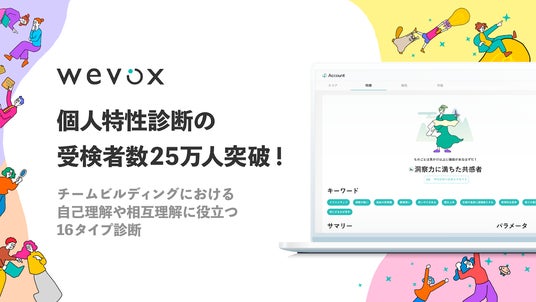 People Tech (テクノロジーによって人の可能性を拡げる) 事業を展開する株式会社アトラエ(本社:東京都港区、代表取締役CEO:新居佳英、東京証券取引所プライム市場:6194、以下 アトラエ)は、組織力向上プラットフォーム「Wevox(ウィボックス)」が提供する個人特性診断の受検者数が25万人を突破し、業界や年代ごとの特徴が分析できたことをお知らせします。