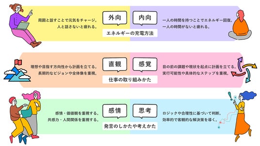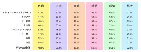 - ICT・インターネットサービス業界では、「直観」や「思考」が優位な特性を持った方が多く、企画開発など抽象的・論理的な思考が求められることなどが考えられます。
